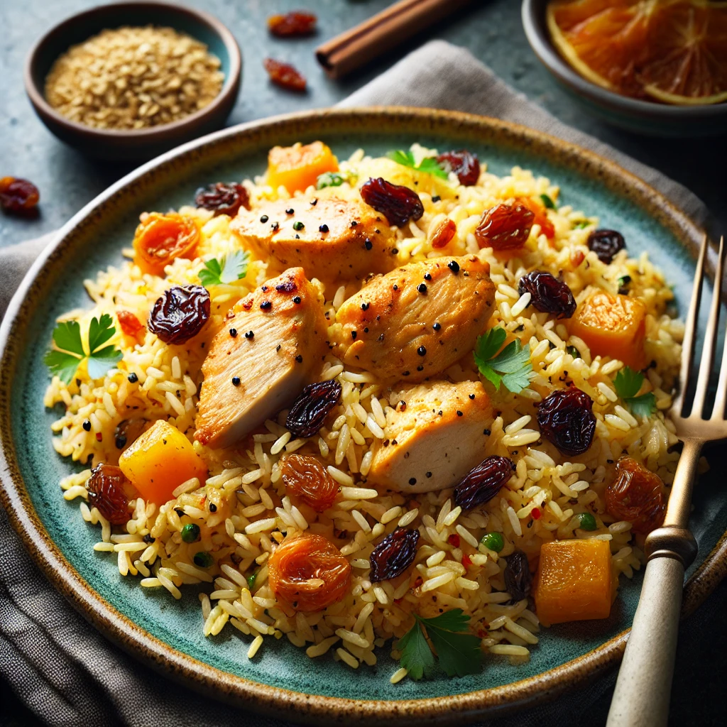 Stir-fried rice with mixed veggies, served with crispy or grilled chicken.